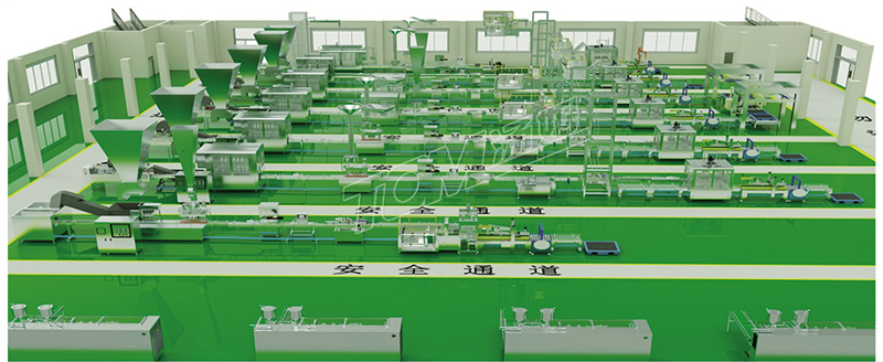 布局:車間按兩層設(shè)計,二層主要用于包材倉庫,加瓶、加蓋、自動開箱及投料。一樓主要有包裝流水線。