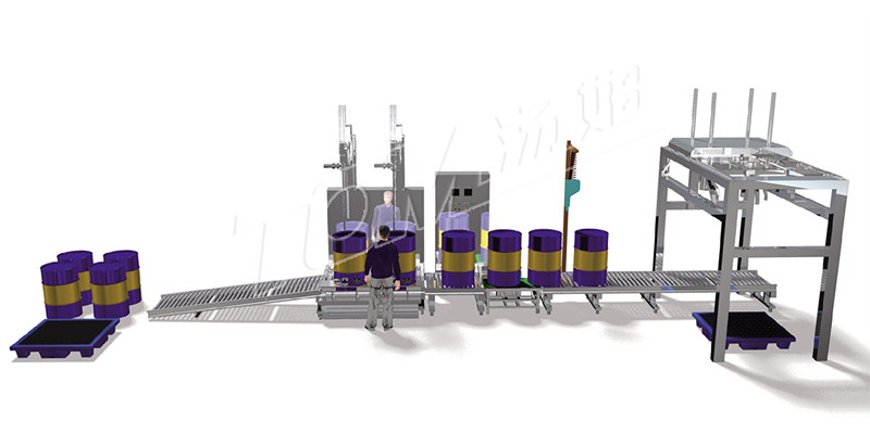 ·200KG塑料桶灌裝線:根據(jù)用戶200KG桶的包裝而設(shè)計(jì),人工將空桶開(kāi)好蓋子擺放在空桶輸送線上,自動(dòng)將桶輸送到雙頭灌裝位置,自動(dòng)對(duì)準(zhǔn)桶口、自動(dòng)灌裝、灌裝結(jié)束通過(guò)輸送滾筒輸送到二次稱重檢測(cè)位置,重量有偏差的停機(jī)報(bào)警,人工處理,人工旋蓋,選好蓋輸送到后端碼托盤位置,人工將托盤擺放在指定位置,每個(gè)托盤上碼4只桶,碼好后人工轉(zhuǎn)移儲(chǔ)存。整條線采用集中控制柜集中控制各個(gè)位置的機(jī)器及連鎖動(dòng)作。